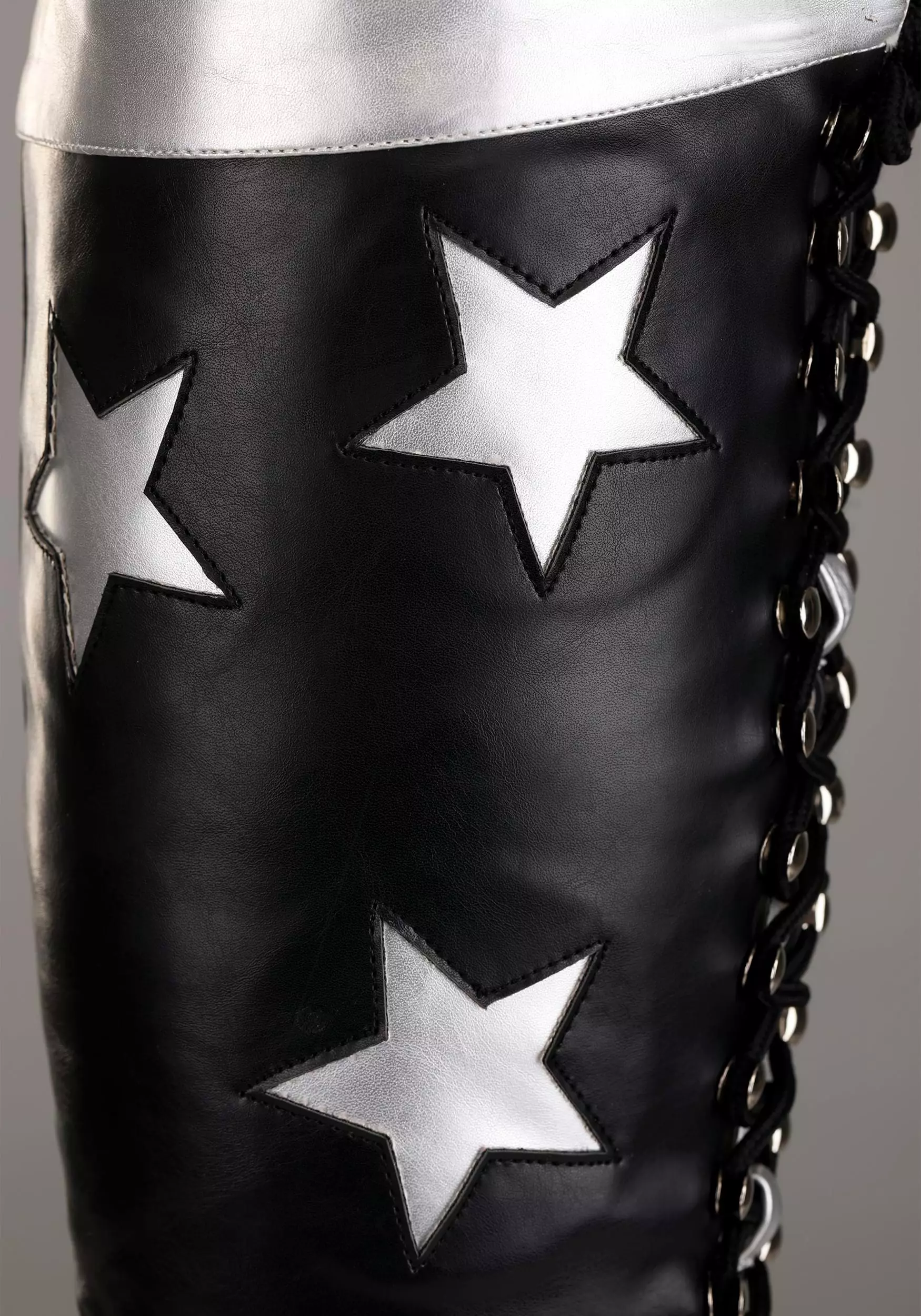 These officially licensed boots are inspired by the ones worn by Starchild during KISS tours. They’re made out of a black vinyl material and have a lace-up front. Silver vinyl stars are stitched onto the sides of each boot and the large platform bottoms are a matching metallic silver. The top of the boots has a bright silver cuff to round out the whole look. You can pair them up with one of our Starchild costumes to transform into the legendary guitarist from KISS! Just be sure to check out all of our KISS accessories to craft a realistic outfit, so you can step on stage with confidence.