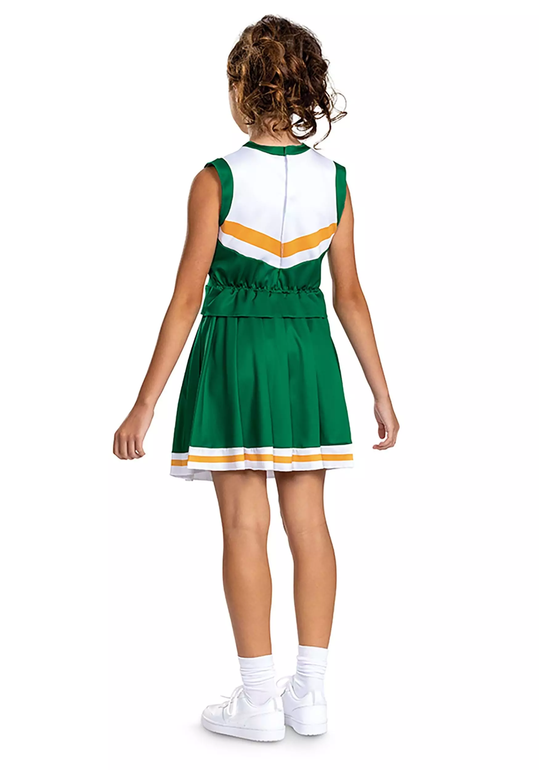 Help your tween enjoy a dream scenario at Hawkins High with this Stranger Things S4 Classic Hawkins Tigers Cheerleader Costume. The officially licensed two-piece ensemble will get your child dressed like the spitting image of Hawkins’ head cheerleader, and role model, Chrissy Cunningham! The costume starts with a pleated green skirt that falls just above the knee. A white and golden-yellow varsity stripe hems the skirt giving it that iconic high school athletics look. The skirt pairs with a color-blocked sleeveless top with a high V-neckline and HHS print diagonally across the image of a megaphone. Dressed like the squad and feeling that “it’s gonna be a great year” energy, your kiddo’s sure to enjoy their time with the Hawkins cheer team!