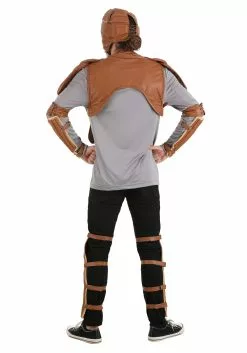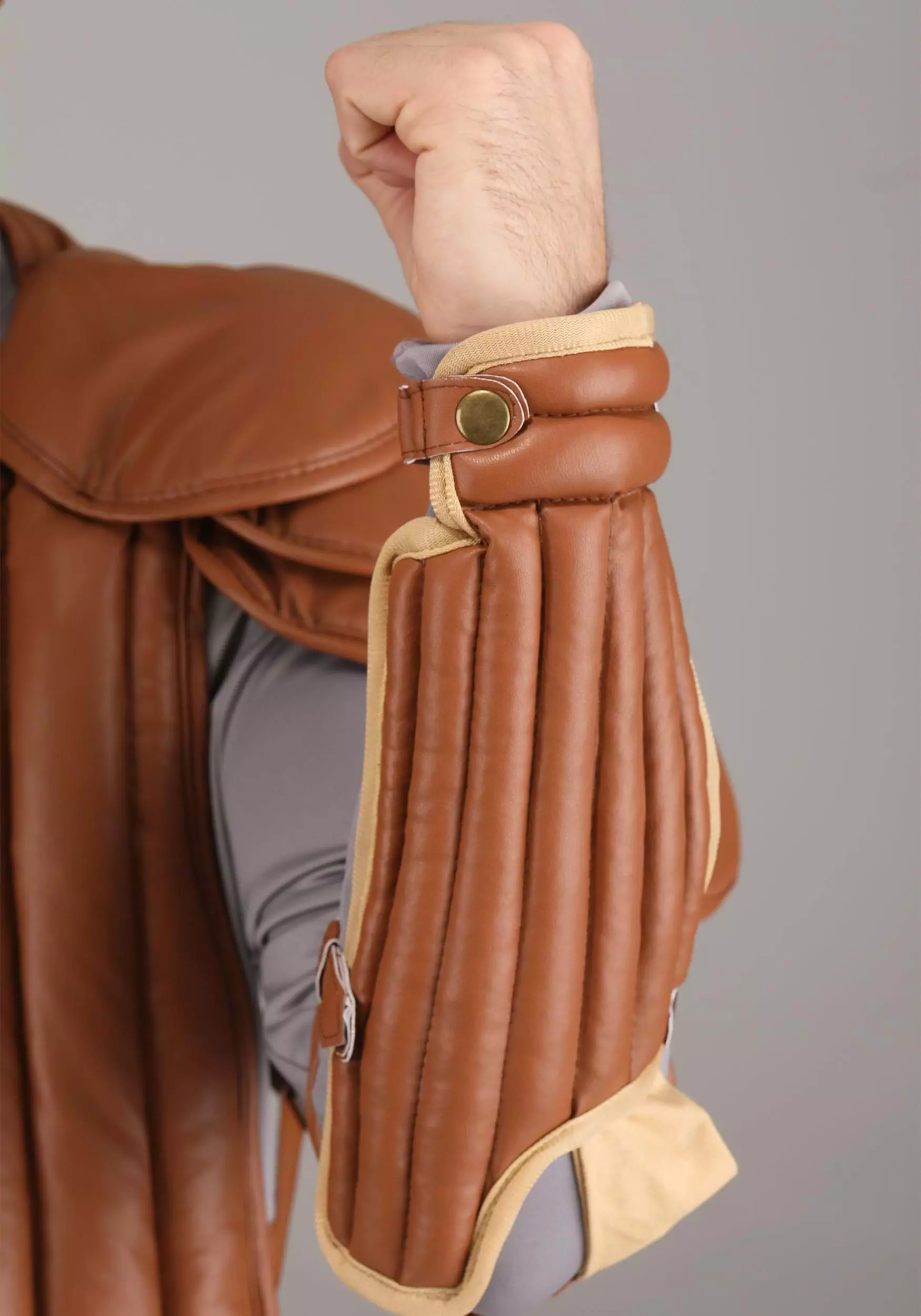 - Gauntlets and shin guards are held in place by length-adjustable faux leather straps with metal buckles