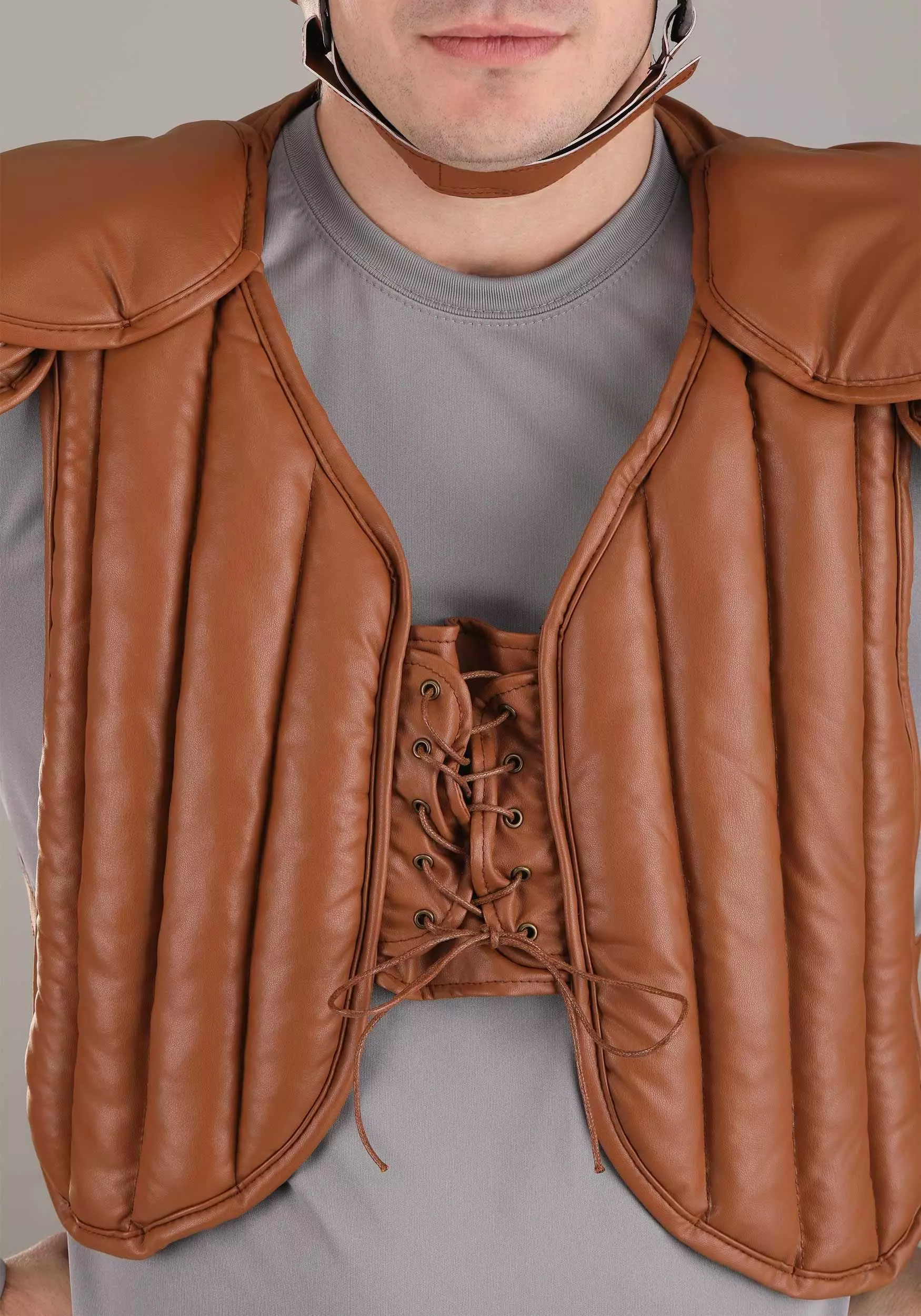 - Chest/shoulder pads slip over the head; fit can be adjusted by loosening or tightening side straps and front lacing