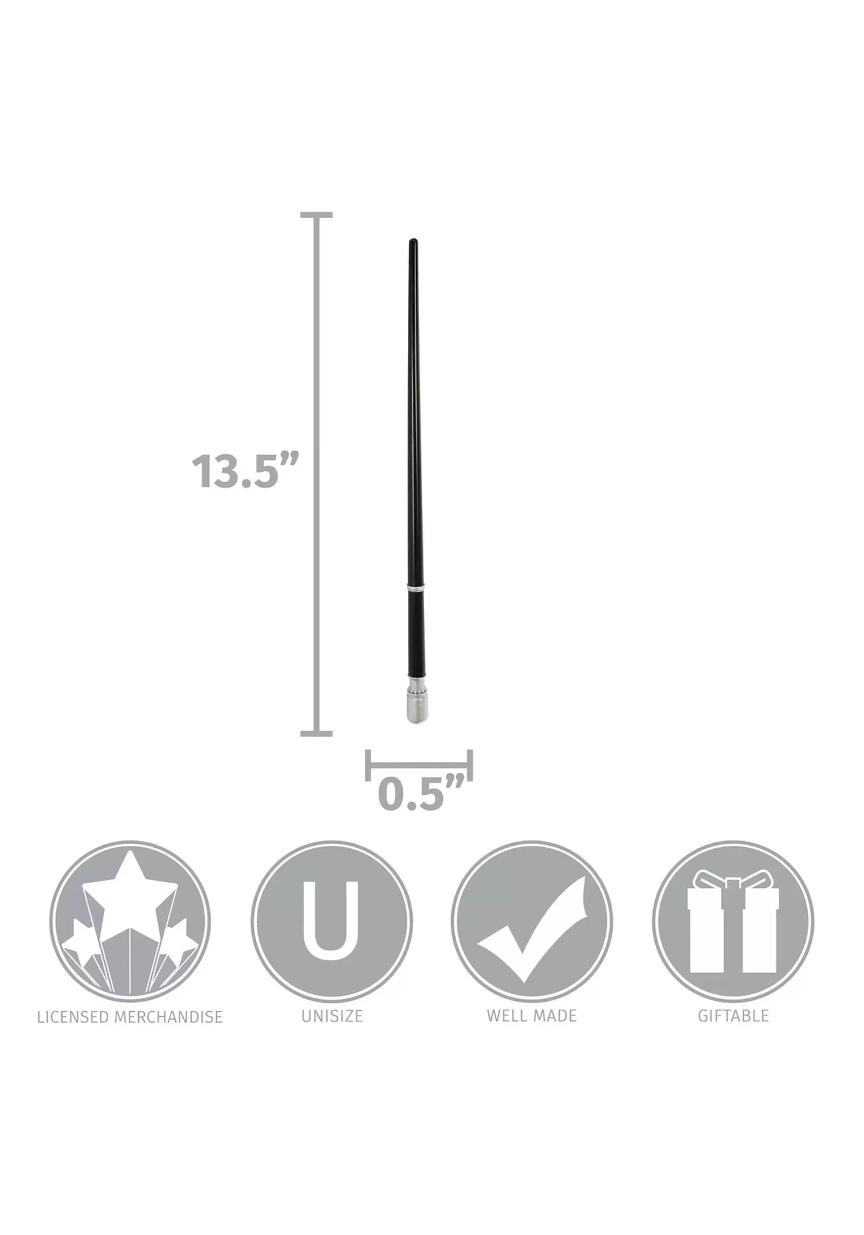 Percival’s wand is sleek, elegant, and simple. While the movie doesn’t say what the wand is made of, this plastic is molded in black, to match the film. The unique feature of this wand is the silver handle detailing, which includes a band of silver along the top and a matching pommel at the bottom. Since we don’t know what the wand core is made of, you can make up your own! Is it a unicorn hair? Maybe a Thunderbird feather? The choice is yours!