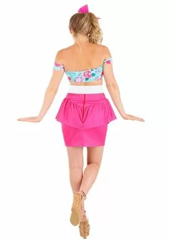This costume is all the rage! It hits so many key style markers of the times. It includes a pullover midriff top with off-the-shoulder straps and bold floral print. The bright pink skirt is super high-waisted, and the white faux-patent belt shines at the top. The satin hair bow plays perfectly against your side pony (duh!), and attaches via a barrette. Accessorize with scrunchies, slap bracelets, jelly shoes, or any other 80s gems you can dream up!