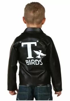 Well, this exclusive Toddler T-Birds Jacket is designed to look just like the ones the T-Birds wear in the movie Grease, so your little guy will look as cool as a real hot-rodder! The jacket features an off-center zipper and wide collar flaps in the front, and the back has the T-Bird’s logo printed in white on it, so everyone knows what gang your little one runs with. The only way they could be cuter if they found a gal-friend wearing one of our Toddler Pink Ladies jackets to recreate scenes of the movie!