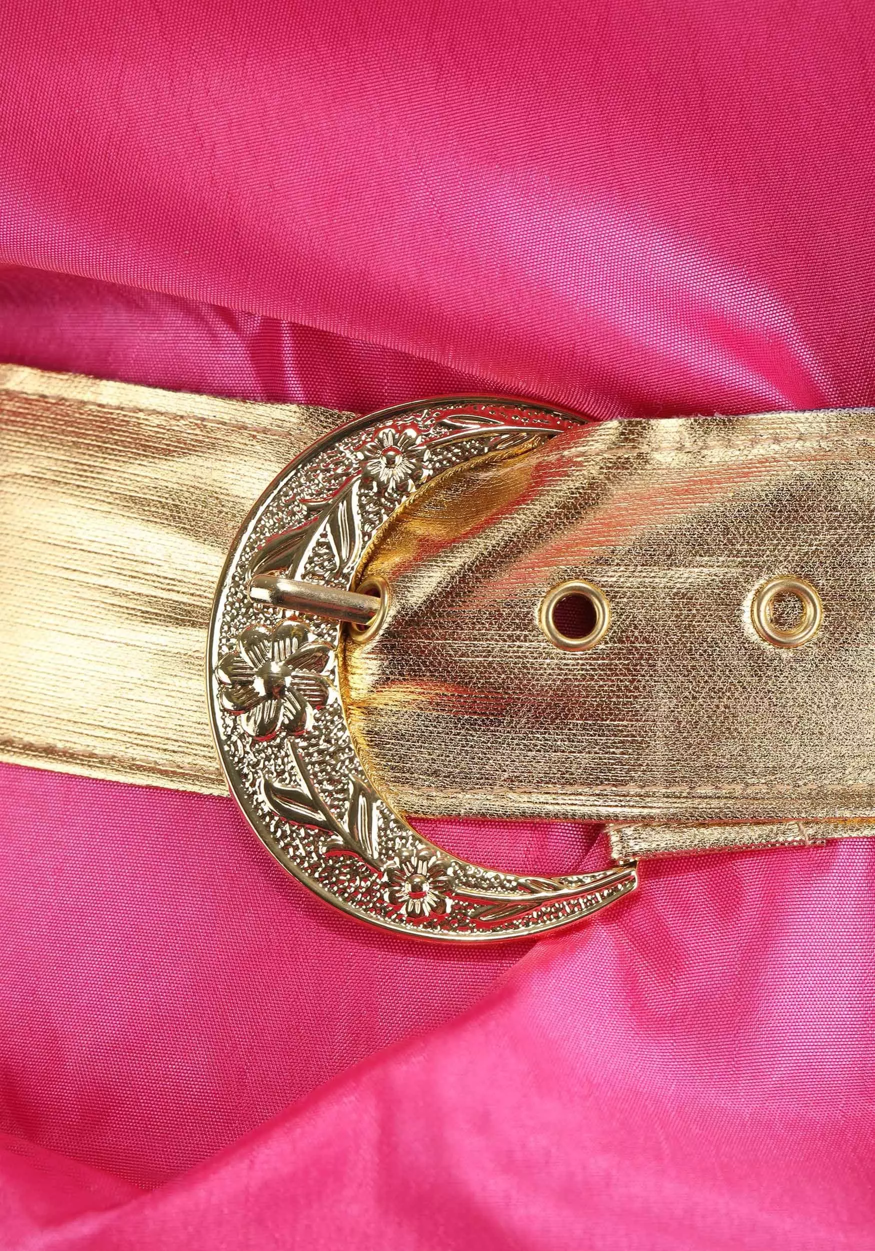 - Metallic gold faux leather belt has gold tone metal buckle at front