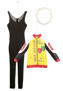 You’ll look stylin’ for the paparazzi in this unitard, jacket, and gold chain. It’s easy to slip into character with a zipper up the back. The jacket has a center zipper with an elastic waistband that celebrates that nineties cut. The jacket proudly proclaims “Mix Maker” to celebrate the secret DJ skills you know are marinating in there somewhere. So slip on some hoop earrings and throw on that “oldies but goodies” playlist cause it’s time to get back in touch with your nineties rap roots.